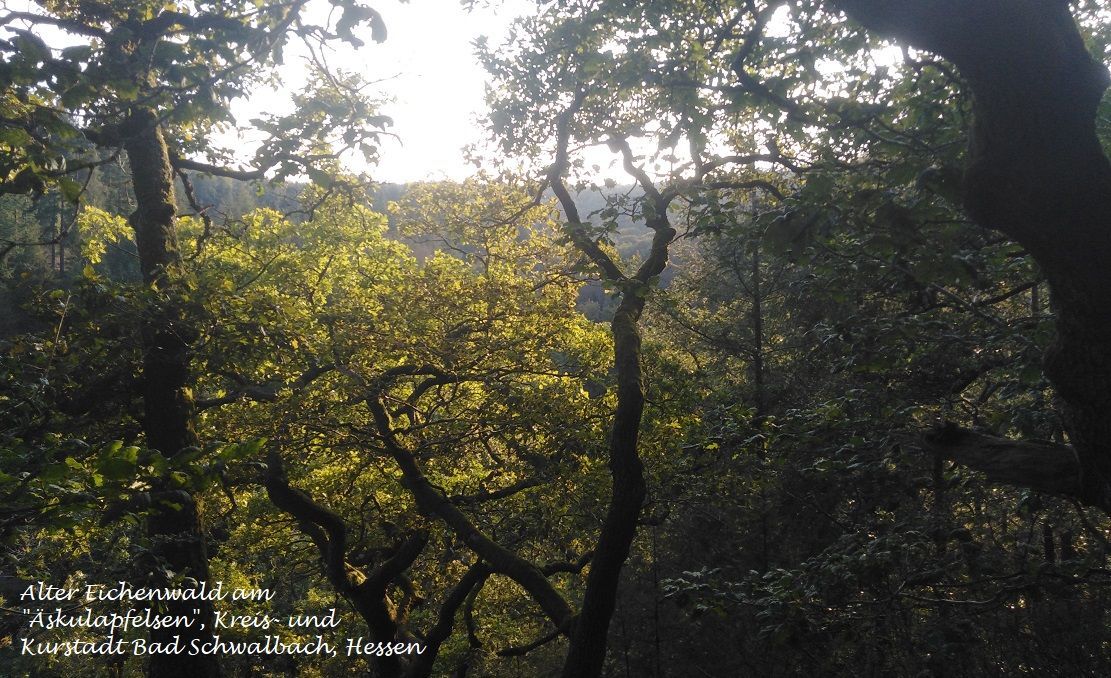 Fotos: von rechts oben beginnend: Äskulapfelsen, Waldsee im Spätsommer, Naturmoorareale im Kur- und Stadtwald Bad Schwalbach, Waldsee im Sommer, Abstieg zum Äskulapfelsen (Weg)